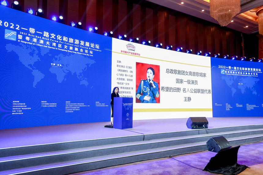 12月19日,2022年“一带一路”文化和旅游发展论坛暨粤港澳大湾区文旅融合论坛在深圳举行,著名女高音歌唱家、国家一级演员王静代表“希望的田野”乡村振兴产业发展平台“名人公益联盟”进行了主题演讲,她说:“作为一名文艺工作者,很荣幸可以参与到乡村振兴的大潮中来,‘希望的田野’给了我们更大的舞台,也赋予了我们更多社会责任。从舞台表演跨界到乡村振兴,是一个巨大的挑战,只有发挥实干精神,把产业落下去,把品牌建起来,把东西卖出去,才能够切切实实扶农助农。”