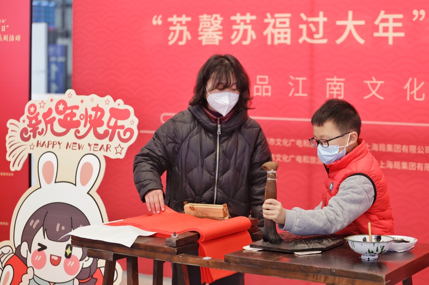 当天上午10点,苏州火车站南侧候车大厅内,一片红红火火的节日氛围。“大展宏兔”“兔年大吉”“春运暖冬行动”背景墙前,不少候车旅客纷纷拿出手机拍照;在苏州桃花坞木版年画展示区,周女士正陪着儿子拓印木版年画,几分钟后一个“福”字跃然眼前。周女士说:“在候车大厅看到这么多的苏州元素、江南文化,感觉很温暖、很有仪式感,是新一年最美的遇见,我们要把这份祝福带回安徽老家。”