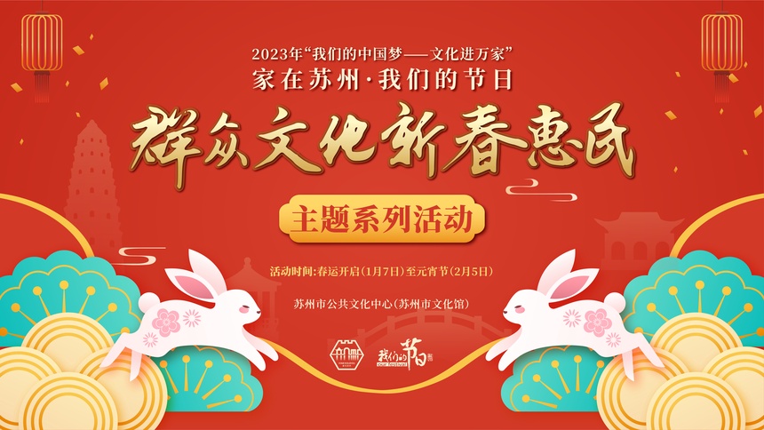 2023年兔年新春即将来临,在春运开启至元宵节期间,苏州市公共文化中心(苏州市文化馆)将以“我们的中国梦——文化进万家”为主题,通过举办共5类14项内容丰富、形式多样、具有“江南文化”特色的展览、演出、公共教育、文明实践志愿服务等系列群文活动,营造浓郁节日氛围,丰富人民群众节日文化生活,凝聚奋进新时代、新征程的强大精神力量。