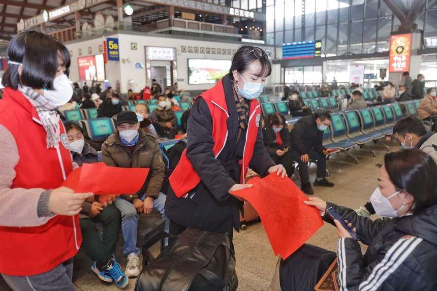 此外,来自文广系统、团市委及火车站的50余名志愿者现场兵分多路,向乘客发放春节对联、新春小礼包等文化年货,给乘客拍摄全家福等志愿活动。苏州市文化广电和旅游局副局长、党组成员、二级调研员花友祥说:“青年志愿者主动投身新春特色文化志愿服务,将关爱送到群众手里、心里,让乘客带着浓浓的新春祝福回家,助力乘客过一个祥和、平和、幸福的年。”