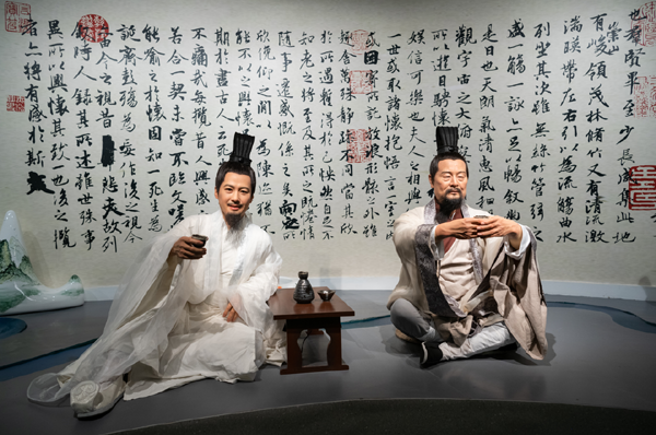 戴着漆纱笼冠、抱膝坐在兰亭之畔的王羲之,站在金黄的稻田场景前、手捧实物稻穗的袁隆平,坐火车奔赴抗疫一线的钟南山,手捧瓷杯边喝大碗茶边看表演的老舍……徜徉在“帷幕开啦”蜡像馆,一处又一处逼真的实物场景令人沉浸其中,很多座名人蜡像都并非单独摆放,而是置身于符合其身份背景的实物场景中,将蜡像馆从“蜡像展示空间”升级为“荟萃游览、互动、体验为一体的蜡像艺术空间”。
