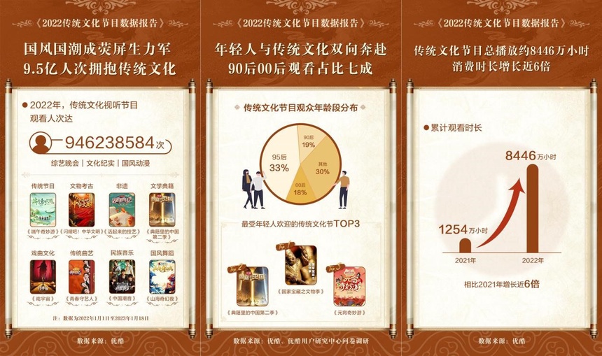 从《青春守艺人》《典籍里的中国第二季》到《新民乐国风夜》《闪耀吧!中华文明》,过去一年,一系列优质传统文化节目登陆荧屏,涉及综艺晚会、文化纪实、国风动漫等内容品类,以及传统节日、文物考古、文学典籍、非遗等多个表现形式。《报告》显示,2022年传统文化节目累计观看时长达8446万小时,相比2021年增长近6倍,消费时长显著提升。其中“90后”和“00后”是观看的主力群体,占比70%。众多受访网友表示,《国家宝藏之文物季》《典籍里的中国第二季》《元宵奇妙游》《博物馆之城》等节目最受年轻人欢迎,传统文化节目持续出圈。
