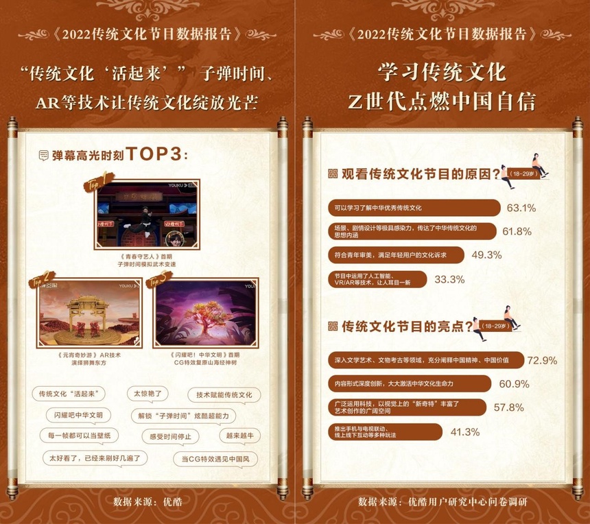 以国产动漫和古风文化为代表的中国风审美潮流屡屡破圈,成为引人注目的文化现象。记者在优酷发布的《2022传统文化节目数据报告》(以下简称《报告》)中注意到,过去一年,国风国潮成荧屏生力军,9.5亿人次通过观看视听节目拥抱传统文化。年轻人与传统文化实现双向奔赴,“90后”“00后”观看占比七成。超六成Z世代认为,传统文化节目深度创新,场景、剧情设计等极具感染力,传达了中华传统文化的思想内涵,是学习了解传统文化的窗口。