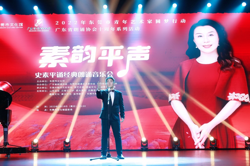 用声音传播中华优秀传统文化,用声音诠释世界美好。3月19日下午,2022年东莞市青年艺术家圆梦行动之“素韵平声”史素平颂经典朗诵音乐会在东莞市文化馆星剧场演绎。本次活动由东莞市文化馆主办,广东省朗诵协会、东莞市音乐家协会、东莞市朗诵艺术家协会协办。