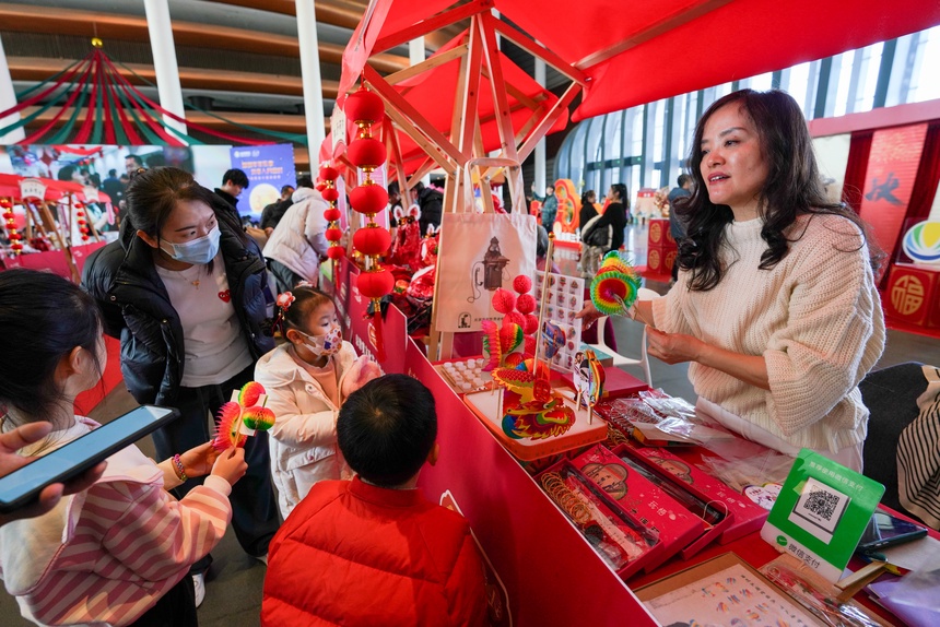 红色的灯笼、红色的展位……活动现场以红色为主色调,布置得古香古色,喜气洋洋。来自京津冀三地的非遗传承人带来了他们精湛的手艺和独特的作品,北京兔爷、纸翻花、天津静花缘绒花、杨村六街彩色剪纸、河北的苏桥熏鱼、玻璃油画……诸多与年俗相关的京津冀非遗代表性项目集中亮相,以展示展销、展演交流、互动体验等形式,让市民游客感受春节喜庆氛围的同时,品尝京津冀三地特色美食,购买心仪的产品,体验非遗技艺,体悟传统技艺与现代创意的完美融合。