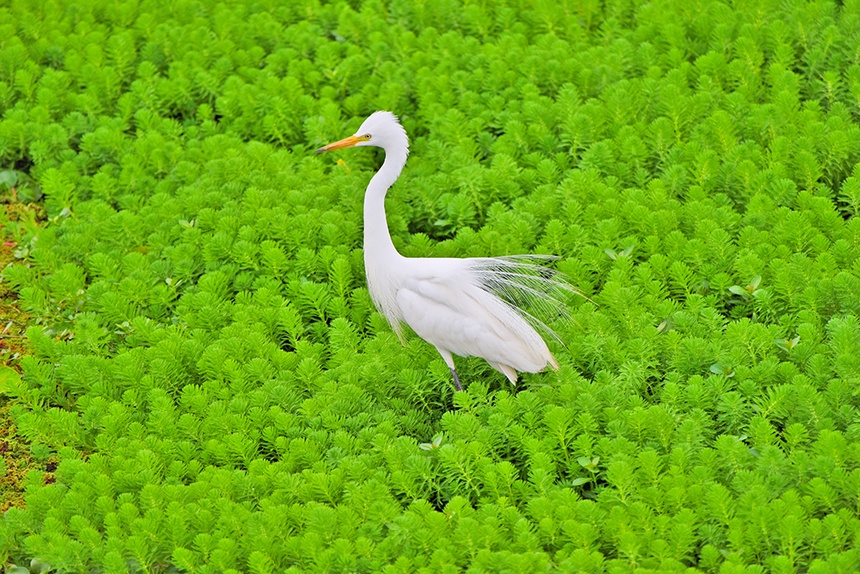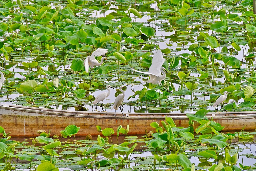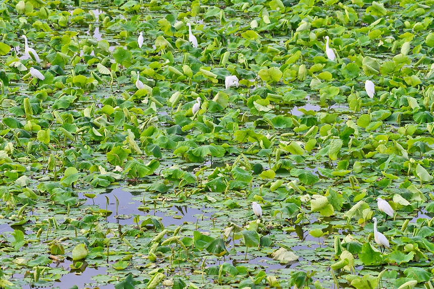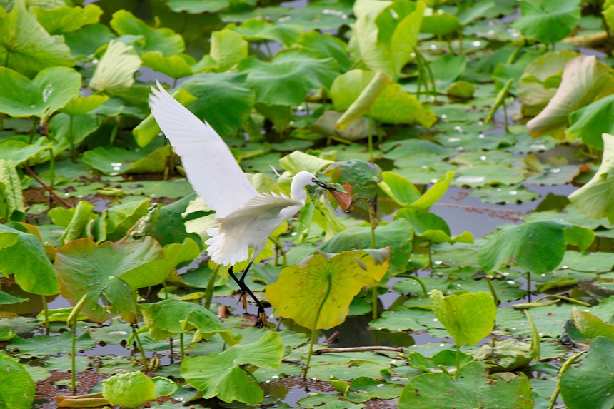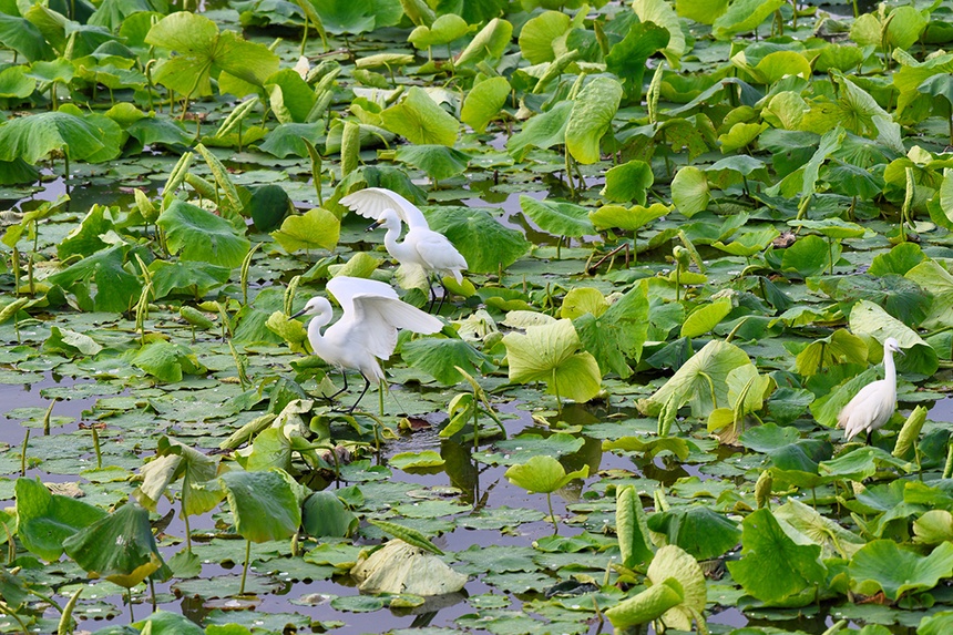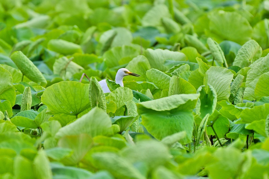 碧绿的莲叶间,一只只白鹭犹如洁白的花朵绽放,为荷塘增添了灵气和层次。如果说春天的美,美在百花盛开、五彩斑斓,那么初夏的美,就美在满目皆绿而秀色可餐。初夏不同的淡绿和浓绿,彰显着自然界千变万化的神奇,充满了勃勃生机。几只自由自在的白鹭,更让整个画面动起来。
