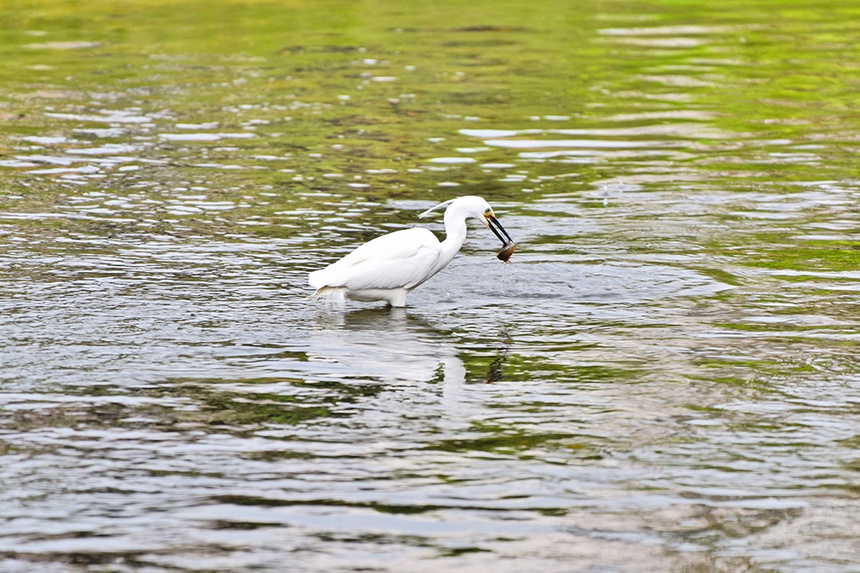 除了荷塘,喜欢水的白鹭还喜欢被柳叶染绿的河,静静地立于水中,等鱼儿游过身旁,就迅速捉住做美餐。特别是“扎着小辫”的小白鹭,更喜欢逗留浅水河。