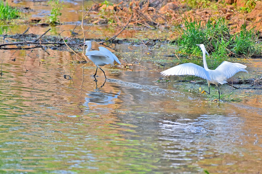 在昌宁,人与鹭都是山水田园的主人,在同一个家园里相依相伴。不仅牛背鹭喜欢与人一起耕作、一起放牛,就连中白鹭、小白鹭在荷塘、在田间,也很少会因人的活动而受影响。人在水边走,鹭在水中嬉,构成了人与自然之间自然而然的和谐。