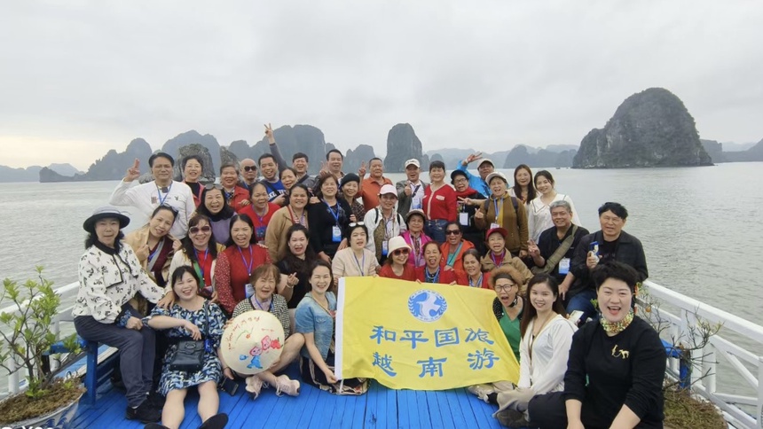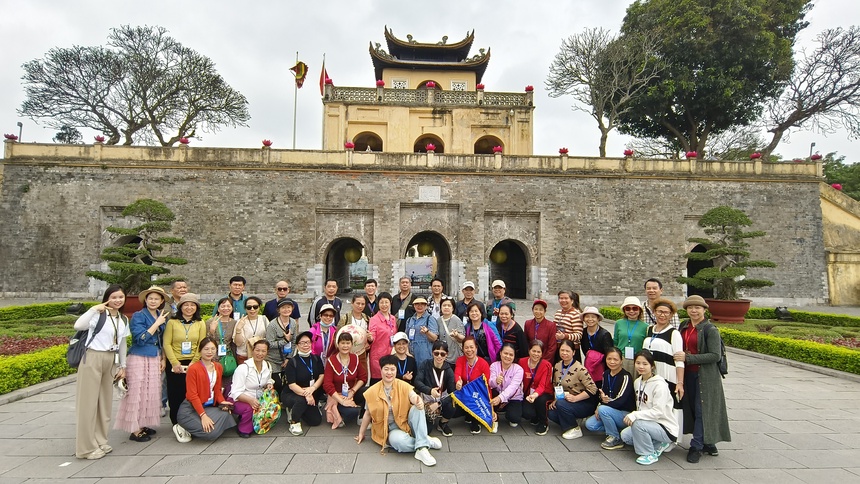 首批出境越南游的中国游客在越南河内升龙皇城前合影
