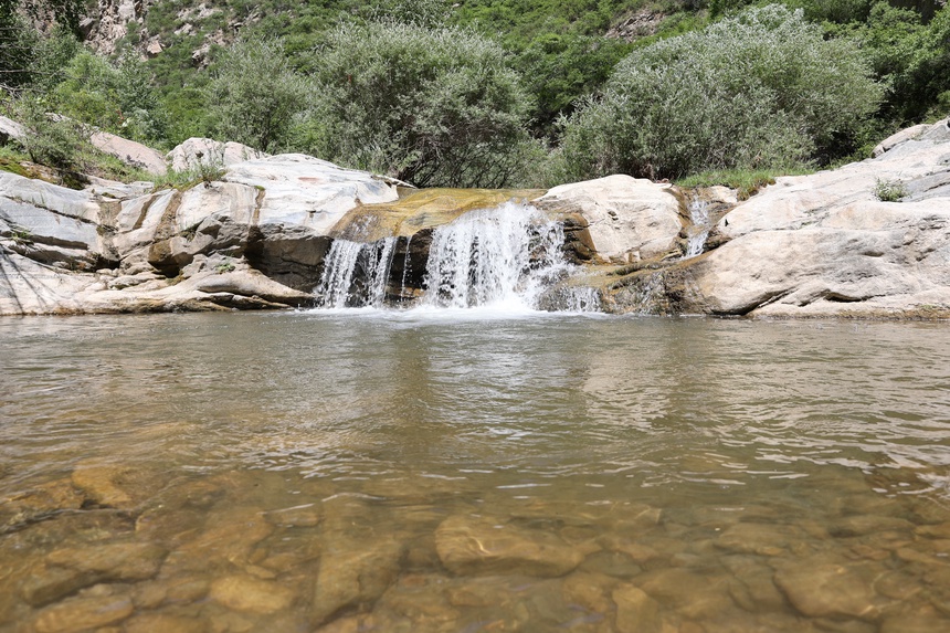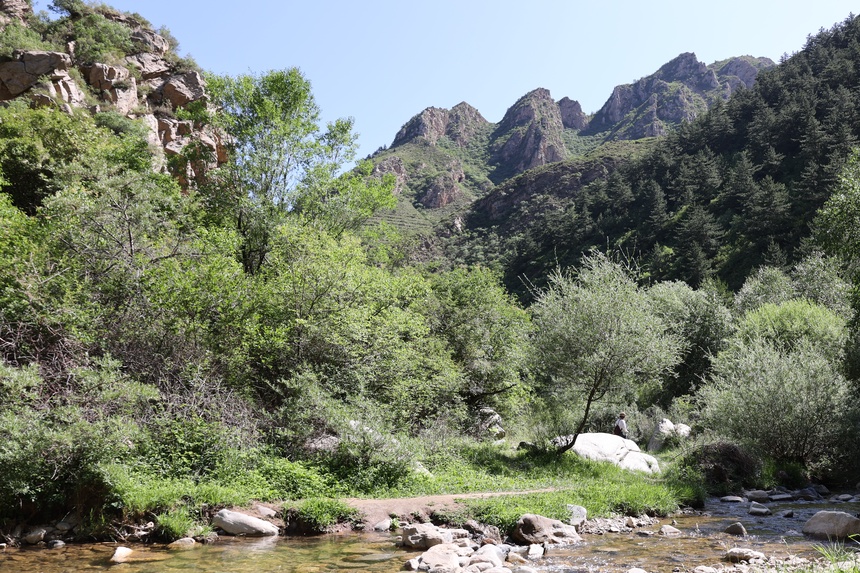 沿谷底初入龙蓬峪,河床较宽,视野开阔,满山苍翠,古寺梵音,民俗驿站,近几年文旅成效绽放光彩。逾往里,须步行。河岸收窄,芳草茵茵,野花引蝶,流水灵动,奇峰遮天,林木茂密,曲径通幽,大自然原始气息侵入身心,只想放慢脚步,细细体味。
