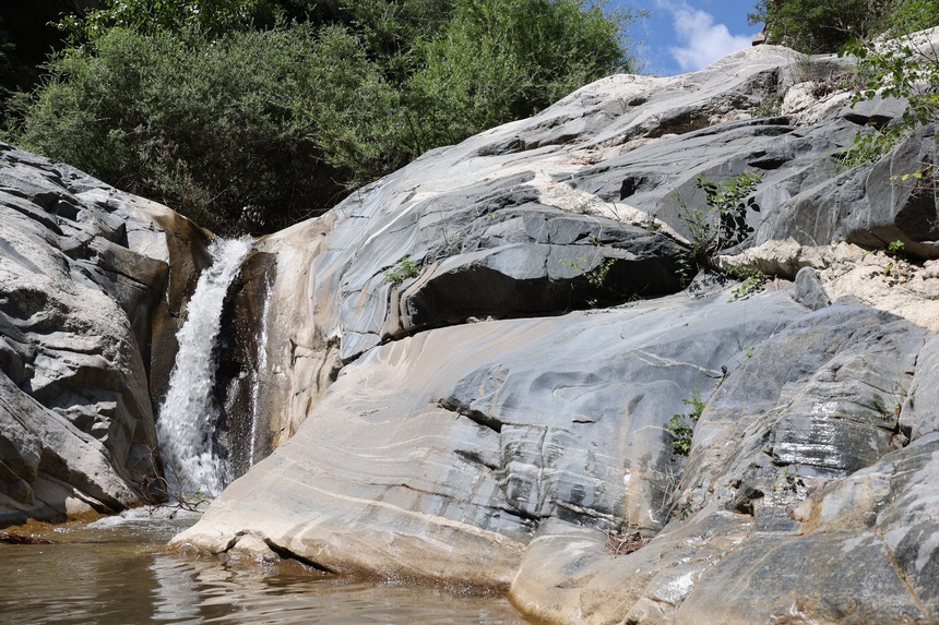 在龙蓬峪穿行体验,奇景不断,惊喜连连,一路总是在兴奋与期待的交织中。走着走着大山迎面当道,就在为山穷水尽而茫然时,又峰回路转,柳暗花明,豁然开朗;看似延绵不断的群山,却突然从山涧冲下一泓清泉,占尽风光,不问归期;正置身花草芬芳、蓝天白云的悠然空旷而仰天长啸时,却又丛林密布,遮天蔽日,不得不屏息凝神,弓腰慢行,就在走出丛林时,却又巨石就地,得在石头上慎行,惊险刺激,其乐无穷;最惊叹的是整块河床石,历经岁月洗礼和流水冲刷,形成多个相连的天然浴缸,奇形怪状,石破天惊,人间绝唱,大自然的鬼斧神工一览无余。