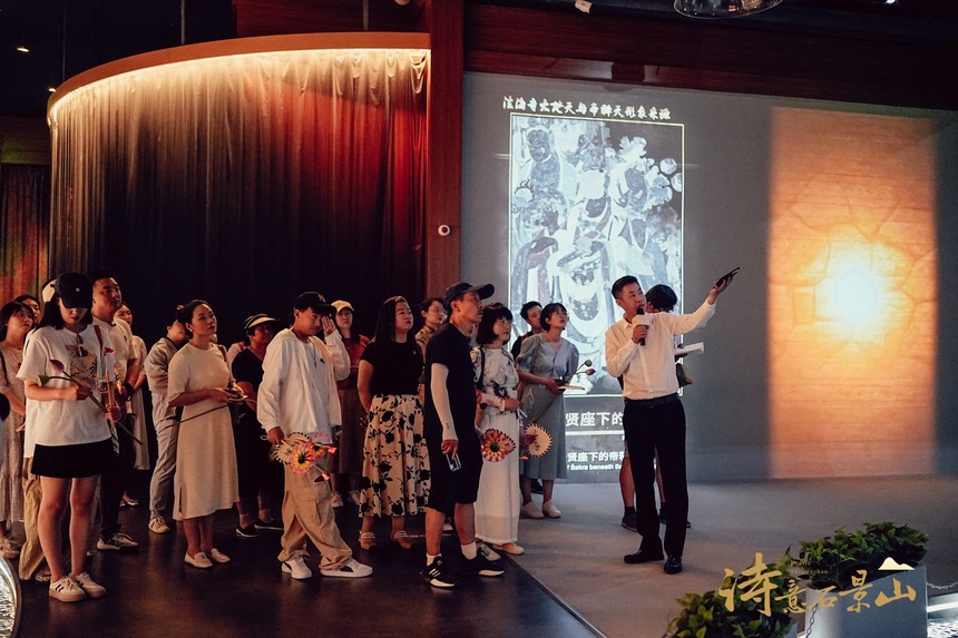 法海寺壁画艺术馆运营总监刘会雨(拿话筒者)向大家介绍法海寺壁画