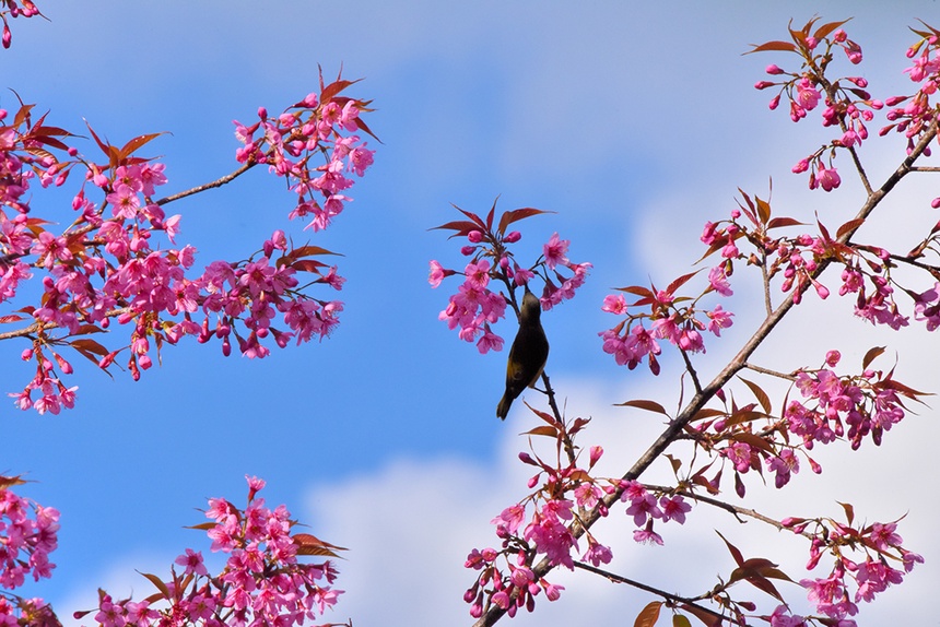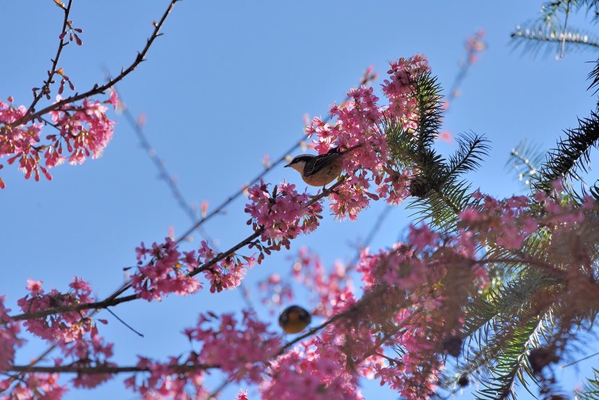 赏樱花,是昌宁冬日里最浪漫的事。无论是自然生长的,还是人工种植的,云南山樱都会在这个季节里相约盛开,用一片片粉色“雪片”,将本就不太冷的冬天装点成童话世界。樱花的世界里,最快乐的是鸟儿,唱着婉转的歌、跳着曼妙的舞,与樱花同乐,婉若鸟语花香的春天。走进这样的冬天,即使心里有再多烦忧,也会跟着鸟儿的快乐而烟消云散。