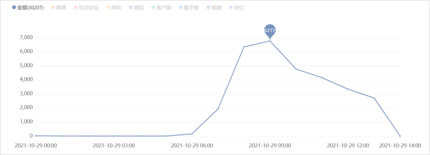 以10月29日0时至10月29日14时为周期,通过中国文化传媒集团舆情系统进行信息检索发现,舆情高点出现于10月29日9时。